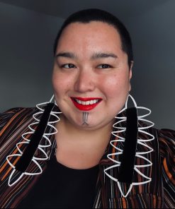 These striking earrings feature black-dyed sealskin paired with natural beads and elegant dentalium shells, finished with 925 silver hooks. Measuring 23 cm long, they are a bold and unique accessory.