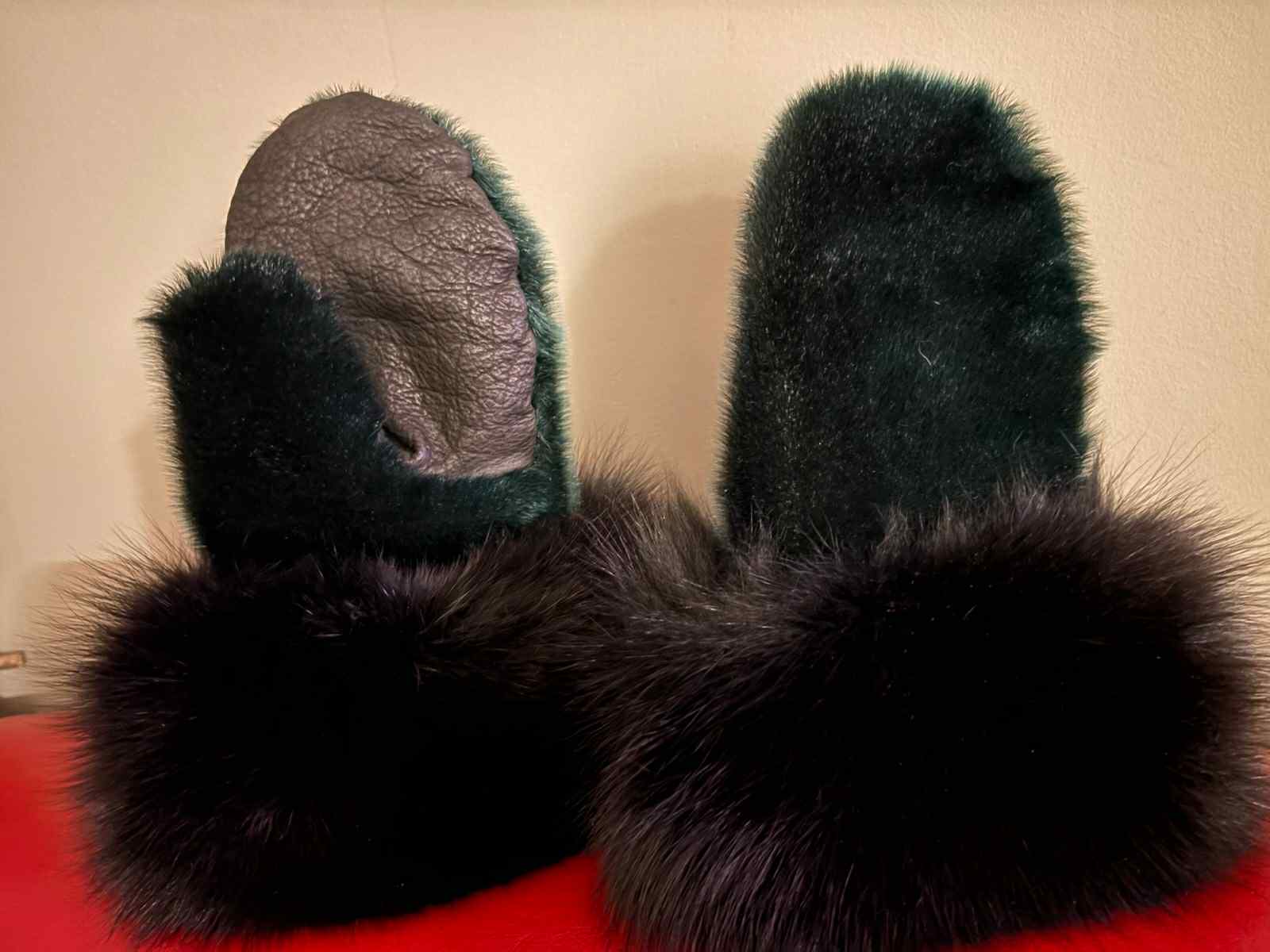 Green sealskin mittens, trimmed with fluffy black fox fur, are incredibly warm, soft, and stylish for winter. Black bison hide palm.