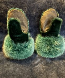 Experience warmth and Arctic elegance with our Green Sealskin and Fox Fur Trim Mittens. Handcrafted from rich green sealskin and accented with lush fox fur, they feature a soft wool lining for comfort and black buffalo hide palms for durability and grip — perfect for everyday wear and cold-weather adventures.