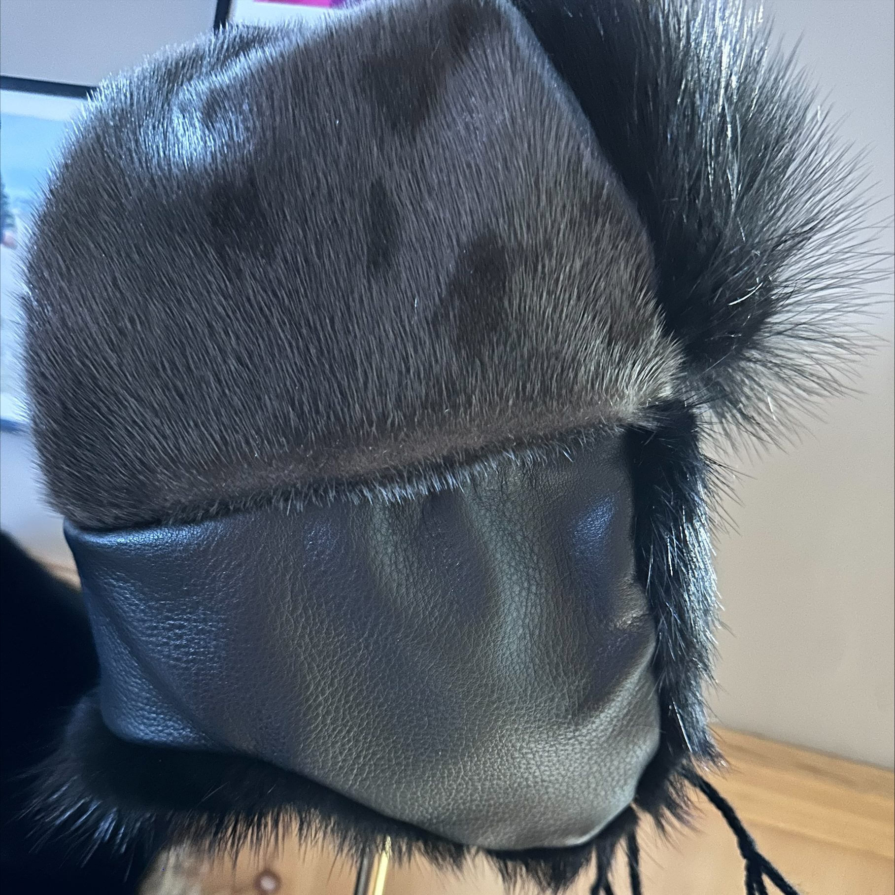 A premium trapper hat made from harp seal, dyed black beaver, and cowhide leather—designed for warmth, durability, and classic winter style.