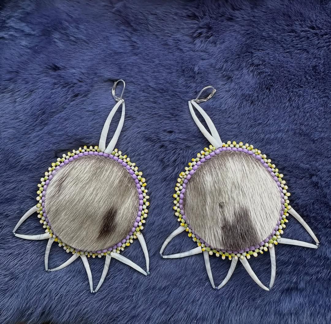 Crafted with double-sided lavender sealskin and a 6 cm circular design, these earrings hang 12 cm long and are completed with sterling silver hooks for a refined finish.