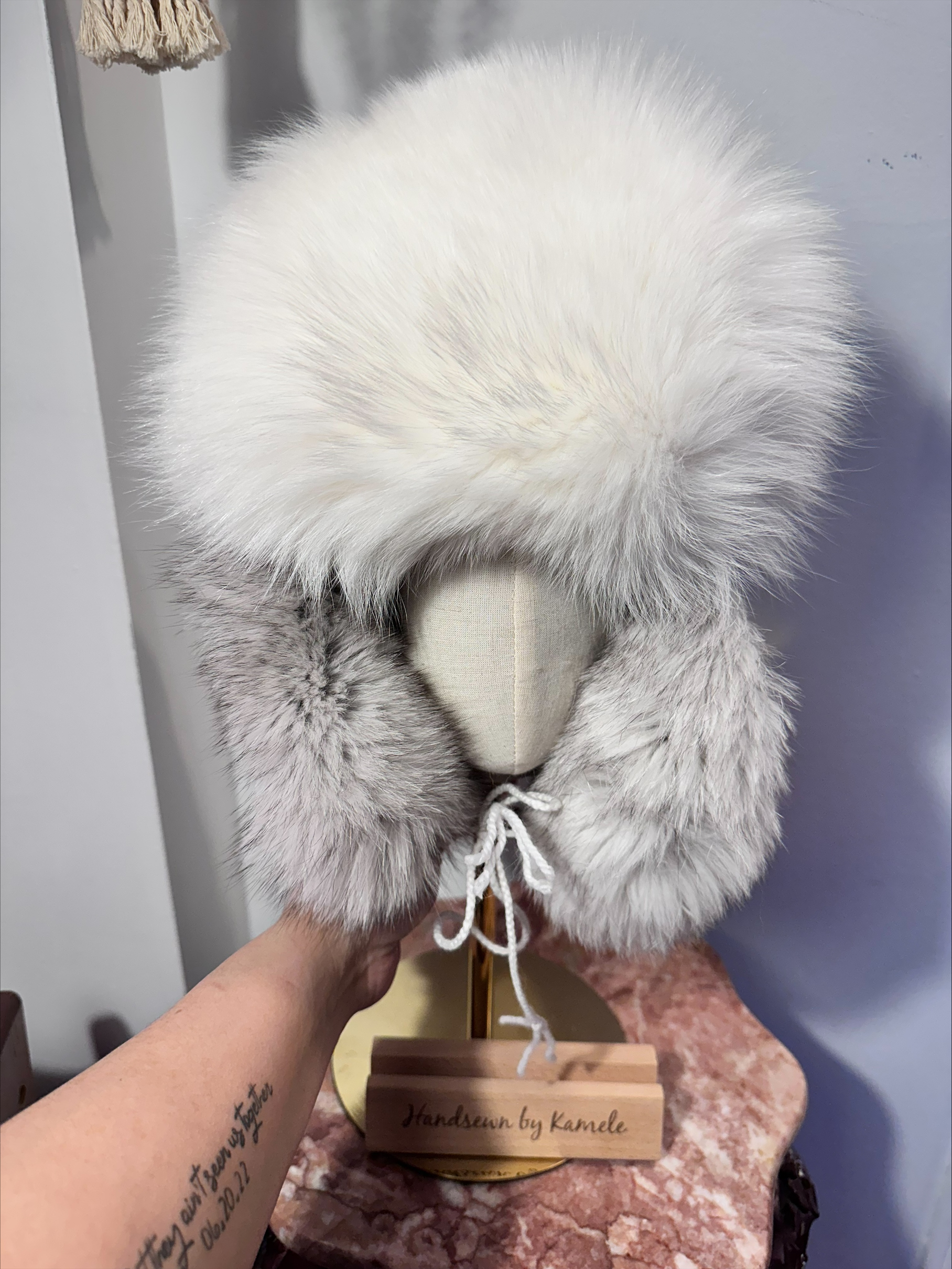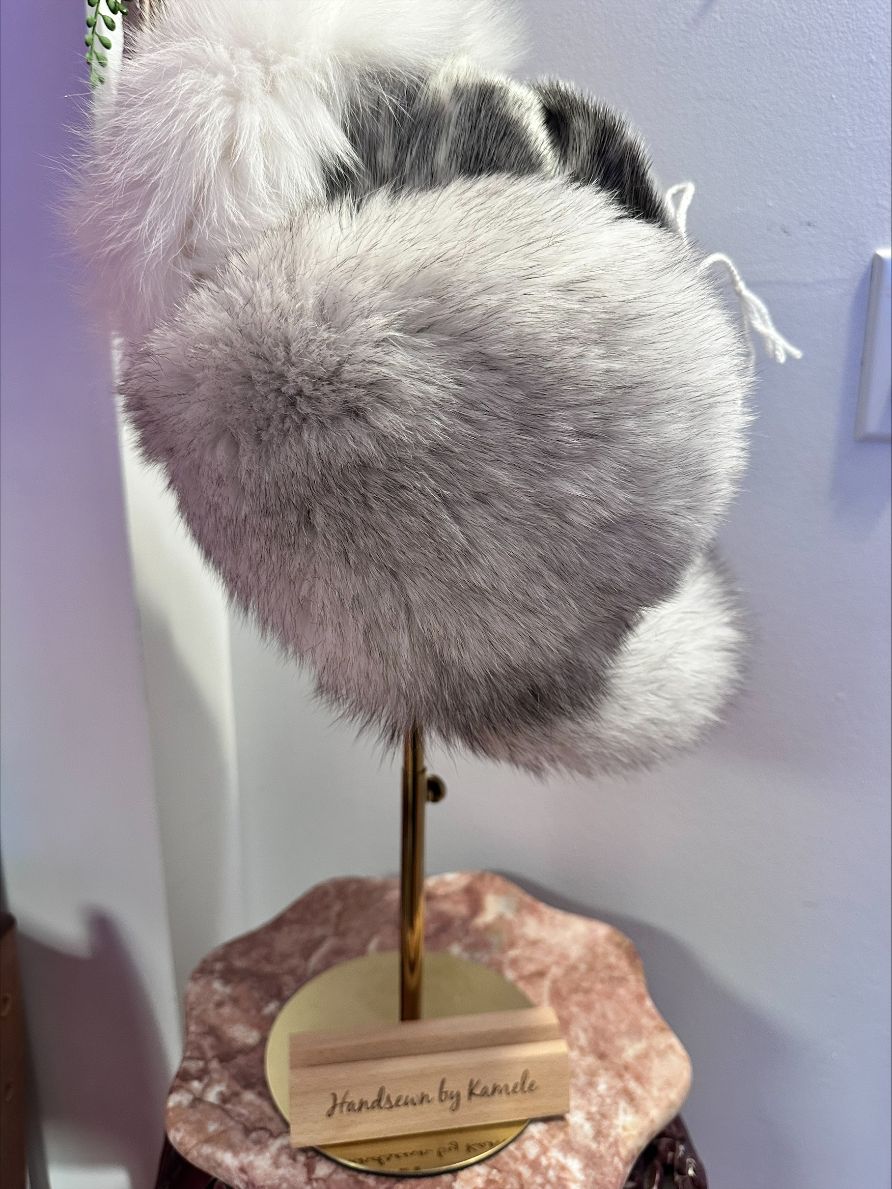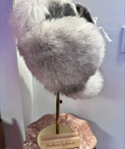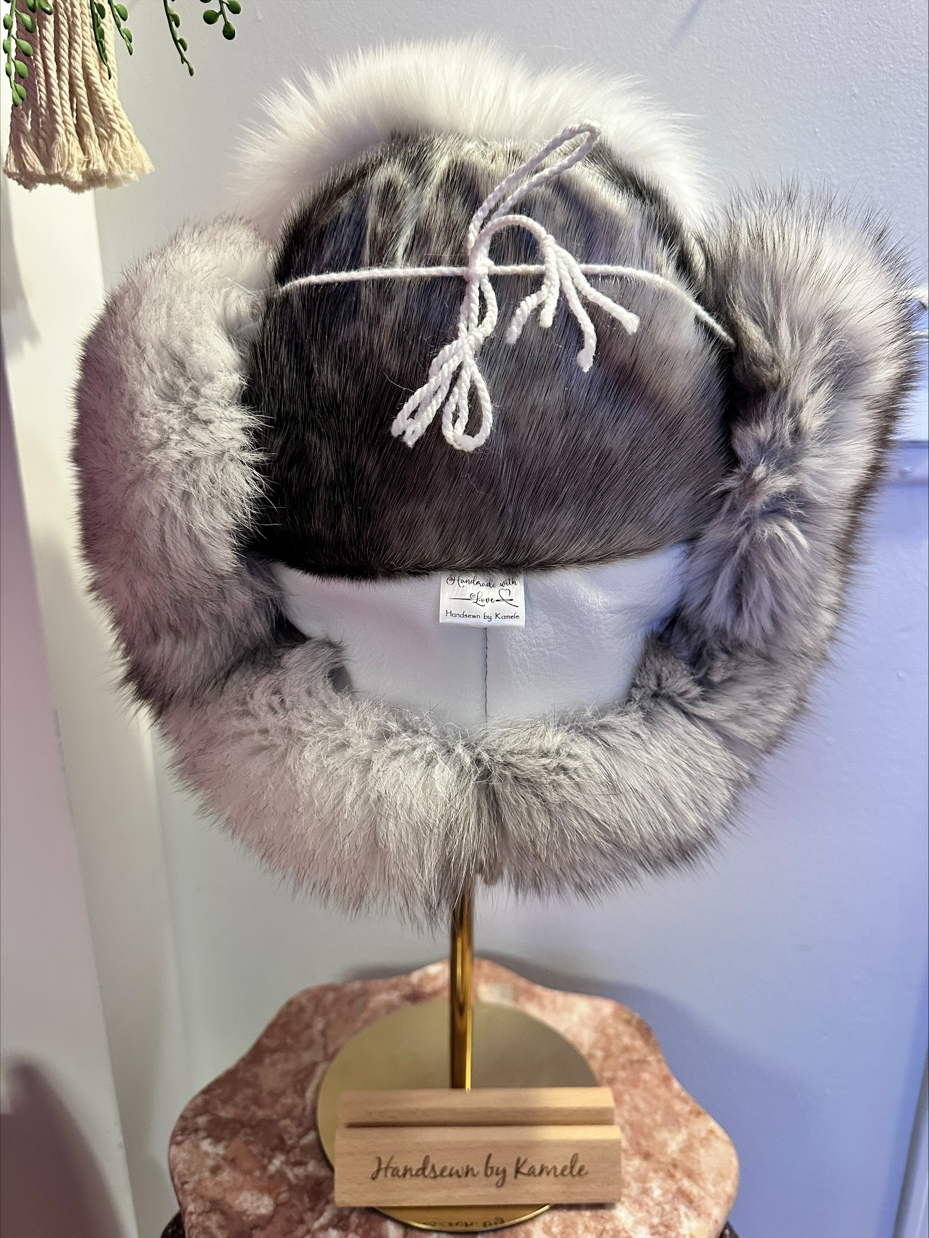 Trapper hat crafted with ringed sealskin, fox fur, and white hide. Warm, durable, and designed for comfort.