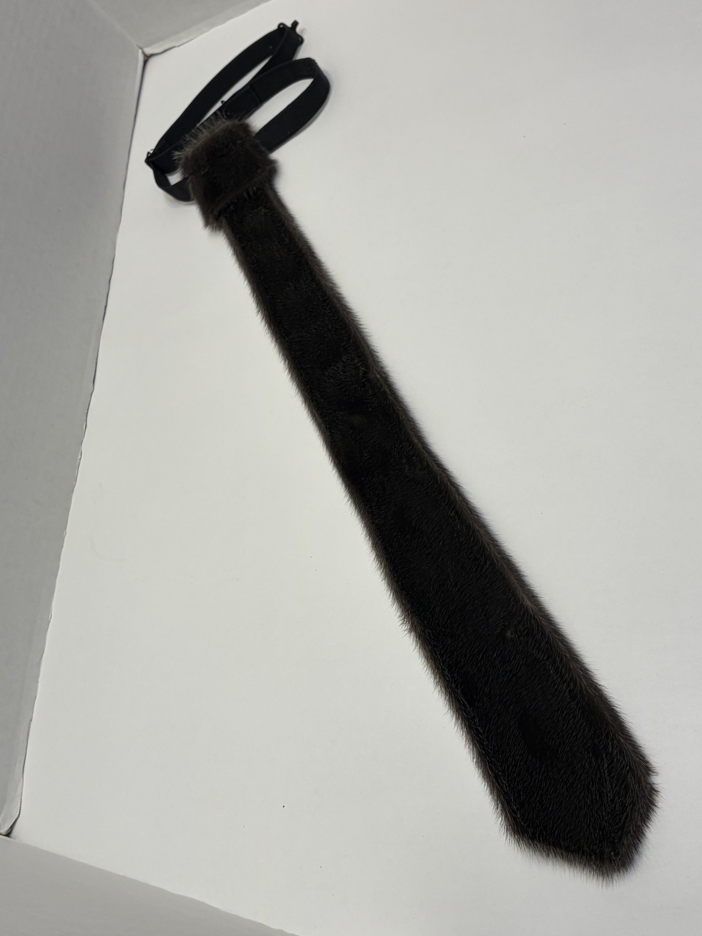Sealskin necktie with an adjustable strap, made to order. Standard length 22½ inches or made to your custom size and colour. Ships approximately 2 weeks after ordering.